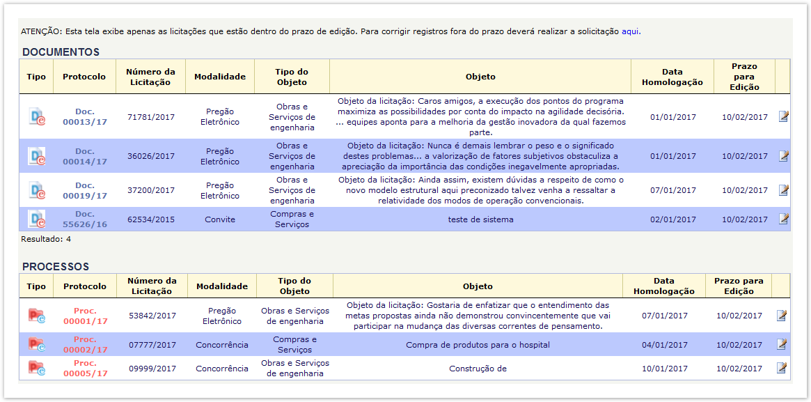 O usuário poderá editar informações de licitações dentro do prazo estipulado para envio, através do ícone Corrigir Licitação.