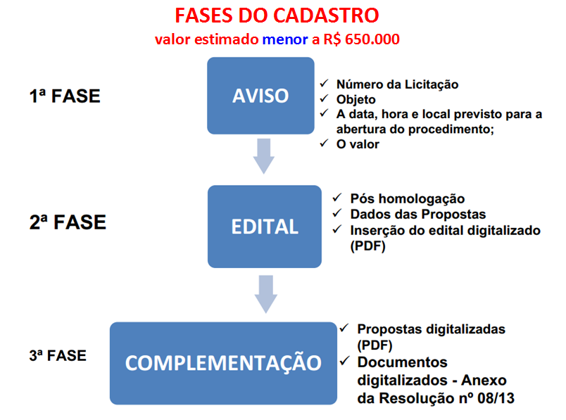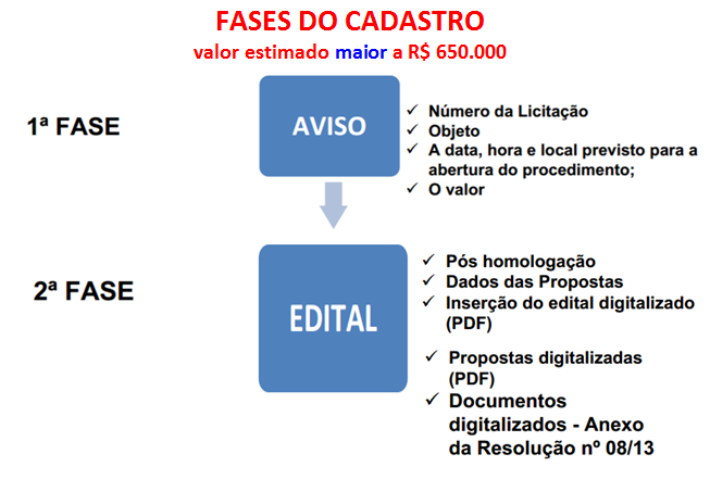 1. AVISO: deve ser informado após a publicação do edital ou convite. Cadastrado com as informações básicas do processo e do futuro certame. O prazo para envio é de 2 dias úteis após a publicação do edital/convite.